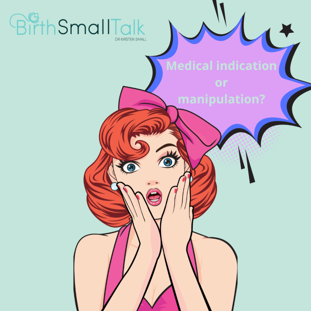 The idea I want to bring out into the daylight, is how the concept of something being medically indicated can be used to manipulate women’s decision making. A medical indication is typically something that makes a certain plan of care advisable, and is used to explain and justify that choice. For example, having severe preeclampsia is a medical indication for induction of labour. I have written before about that way the list of medical indications is created is somewhere on a spectrum between being written on tablets of stone, handed down to new doctors by a supreme being on a mountain top – to being completely made up on a whim.