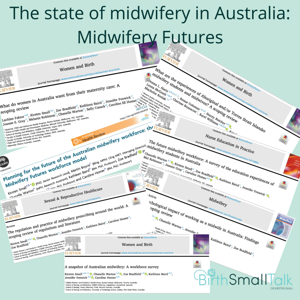 Last year, I was the Senior Research Lead for the Midwifery Futures project. Funded by the Nursing and Midwifery Board of Australia, the project examined the state of midwifery in Australia and made recommendations on how to address the issues identified. I had the pleasure of working with amazing midwifery leaders: Professor Caroline Homer, Professor Zoe Bradfield (current president of the Australian College of Midwives), Professor Jennifer Fenwick, Professor Kathleen Baird, and Professor Joanne Grey; along with Aboriginal nurse Melanie Robinson, and research assistant Chanelle Warton. So many other people were also instrumental in the success of the project, and I won’t name them all here (though you can find them all in the Midwifery Futures report).