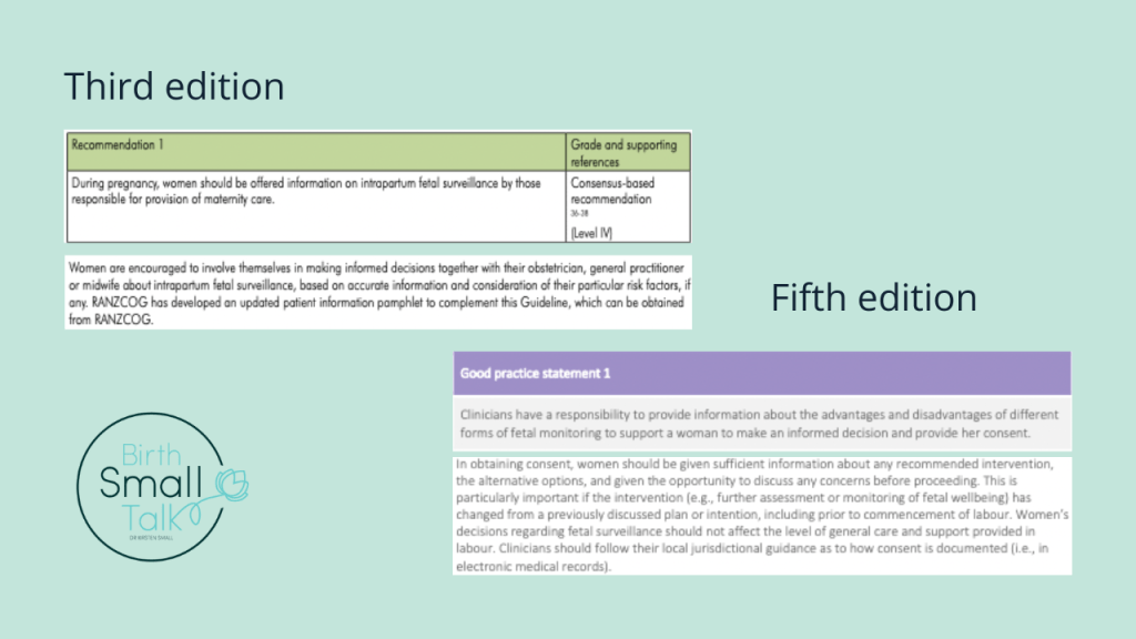 The recently updated edition makes a clear shift. Responsibility for engaging with information now resides with the clinician, rather than with the woman, and the role of the clinician is “to support”. Specific guidance about what to discuss is now set out. The requirement for consent prior to any form of fetal monitoring being used is now explicit rather than implied. This goes a long way towards restoring women’s decision-making authority that was stripped away in previous editions.
