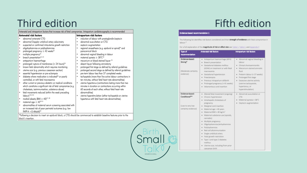 The most egregious of these was in what was recommendation seven, and is now recommendation five. The third edition referenced the 2013 Alfirevic et al Cochrane review, saying that this provided Level I (the highest form of) evidence for their recommendation for CTG use for women with one factors for fetal compromise. I wrote “the Cochrane review concluded that intrapartum CTG monitoring for women with risk factors was not associated with improved perinatal outcome, making it impossible to reconcile the recommendation with this evidence” (Small, 2020, p. 244).