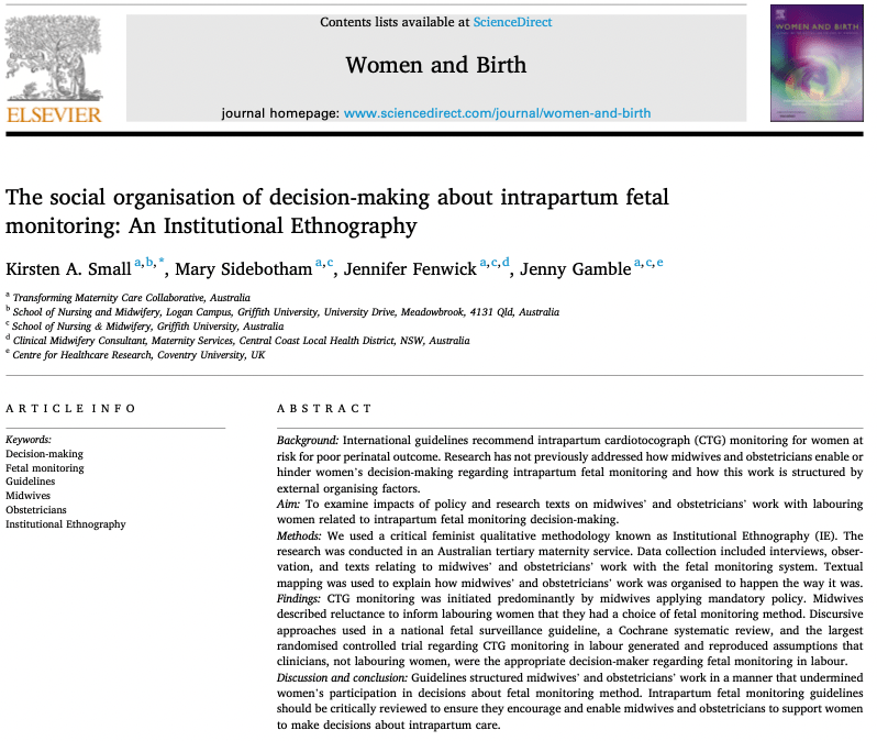 Small, K. A., Sidebotham, M., Fenwick, J., & Gamble, J. (2022, Sep 17). The social organisation of decision-making about intrapartum fetal monitoring: An Institutional Ethnography. Women & Birth, in press. https://doi.org/10.1016/j.wombi.2022.09.004
