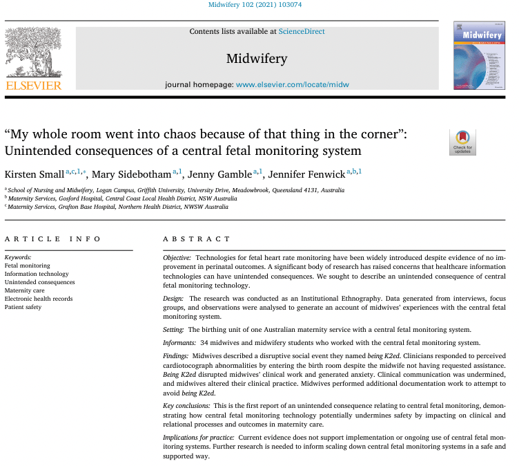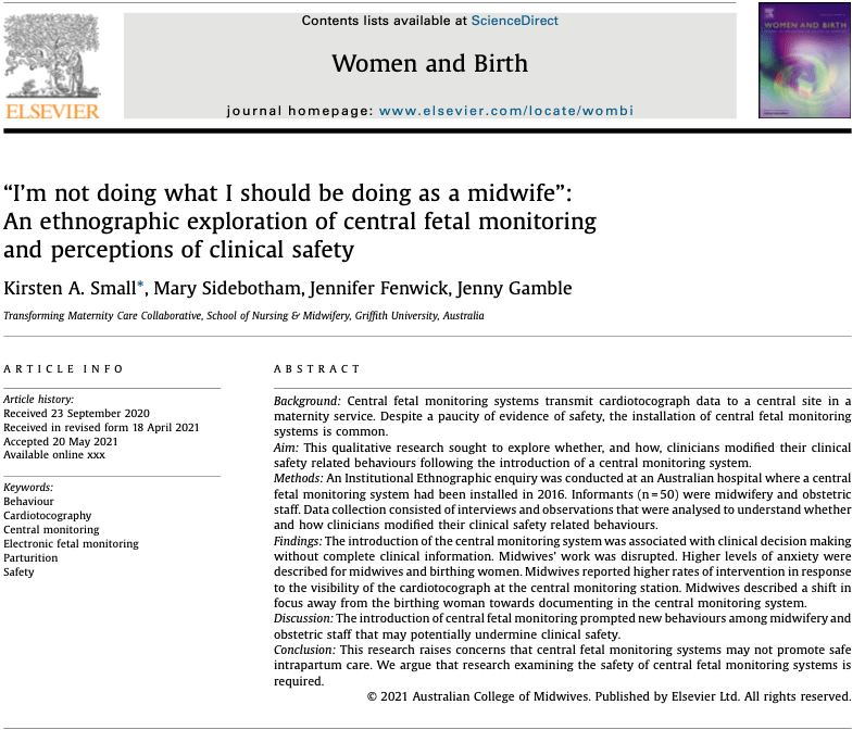 Small, K., Sidebotham, M., Gamble, J., & Fenwick, J. (2021, Jun 24). “My whole room went into chaos because of that thing in the corner”: Unintended consequences of a central fetal monitoring system. Midwifery, 102, 103074. https://doi.org/10.1016/j.midw.2021.103074