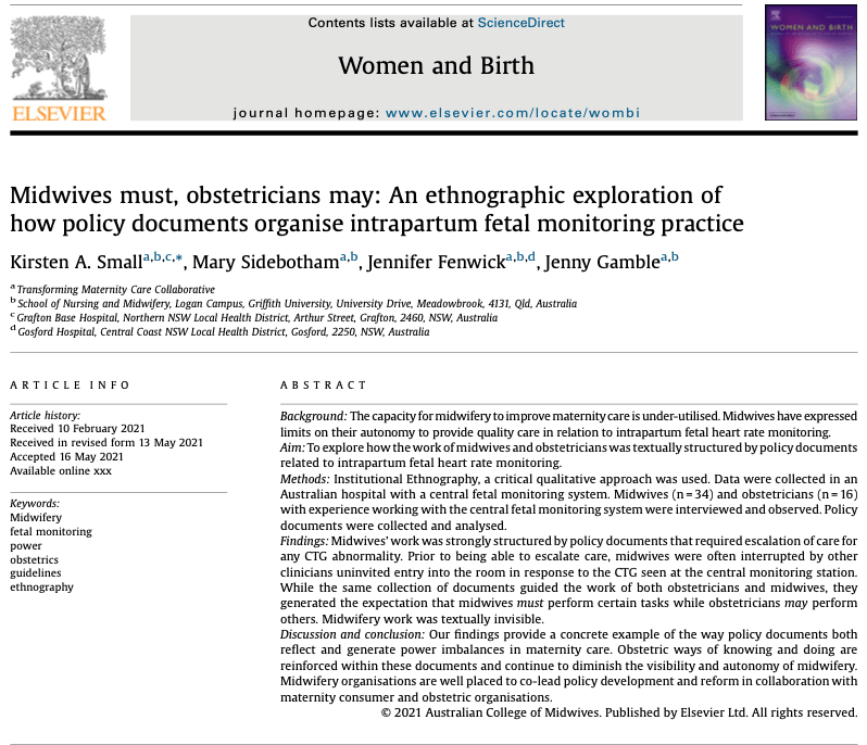Small, K. A., Sidebotham, M., Fenwick, J., & Gamble, J. (2022, Mar). Midwives must, obstetricians may: An ethnographic exploration of how policy documents organise intrapartum fetal monitoring practice. Women & Birth, 35(2), e188-e197. https://doi.org/10.1016/j.wombi.2021.05.001