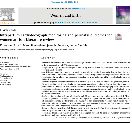 Small, K. A., Sidebotham, M., Fenwick, J., & Gamble, J. (2020, Sept). Intrapartum cardiotocograph monitoring and perinatal outcomes for women at risk: Literature review. Women & Birth, 33(5), 411-418. https://doi.org/10.1016/j.wombi.2019.10.002