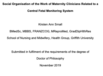 Small, K. A. (2020). Social Organisation of the Work of Maternity Clinicians Related to a Central Fetal Monitoring System. Doctoral thesis, Griffith University. https://research-repository.griffith.edu.au/handle/10072/392850