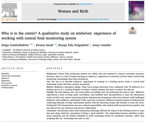 Gottfreðsdottir, H., Small, K., Helgadottir, B. P., & Gamble, J. (2025, Mar 1). Who is in the centre? A qualitative study on midwives’ experience of working with central fetal monitoring system. Women & Birth, 38(2), 101891. https://doi.org/10.1016/j.wombi.2025.101891