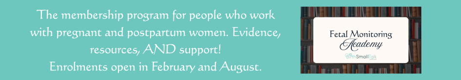 Small, K. A., Sidebotham, M., Fenwick, J., & Gamble, J. (2022, Mar). “I’m not doing what I should be doing as a midwife”: An ethnographic exploration of central fetal monitoring and perceptions of clinical safety. Women & Birth, 35(2), 193-200. https://doi.org/10.1016/j.wombi.2021.05.006